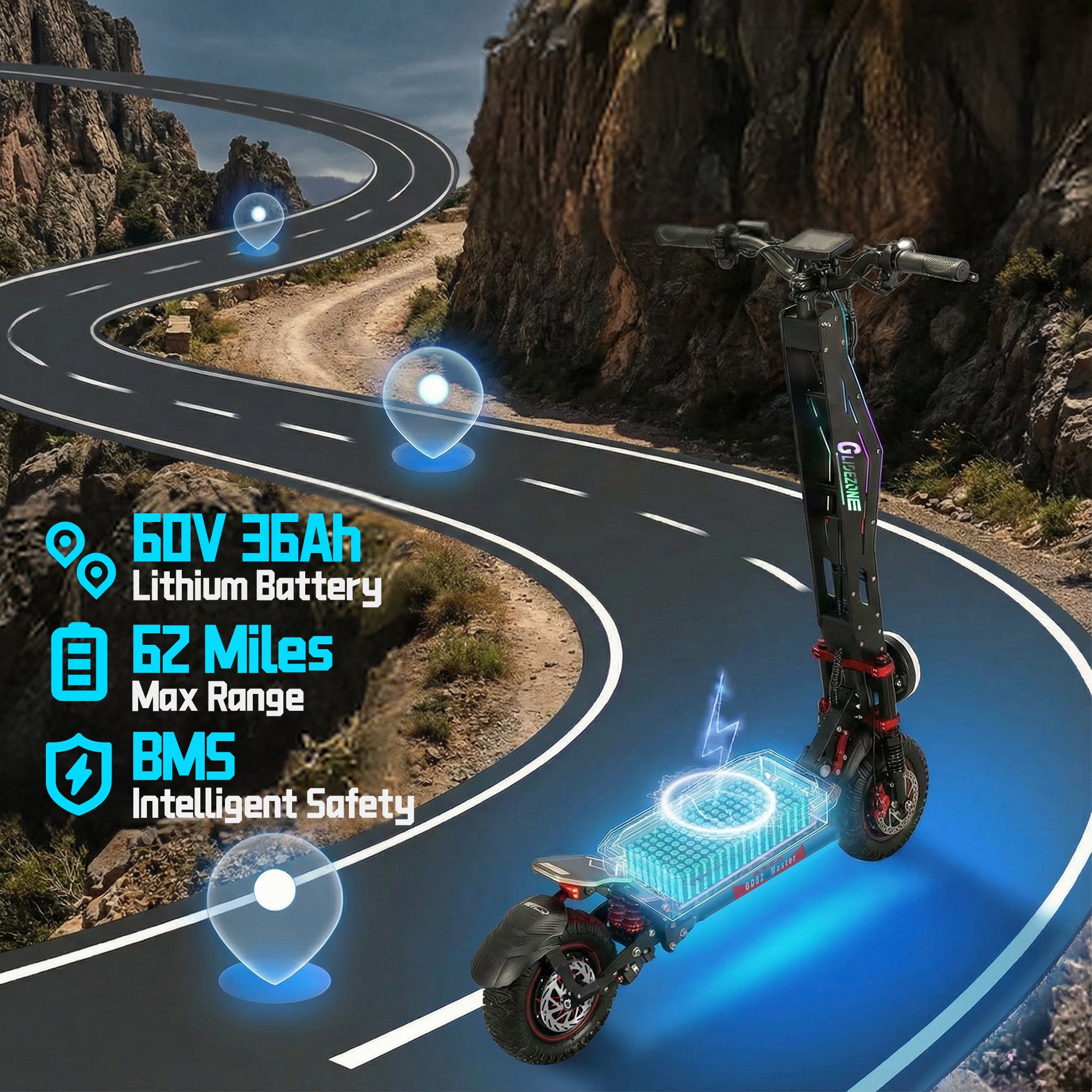 Removable 60V 40Ah Battery — Up to 75 Miles of Range