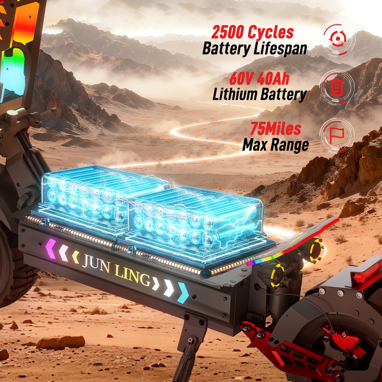 The JL86 Pro features a 60V 40Ah lithium battery with a total capacity of 2400Wh, delivering an extended range of up to 75 miles (120 km) on a single charge.