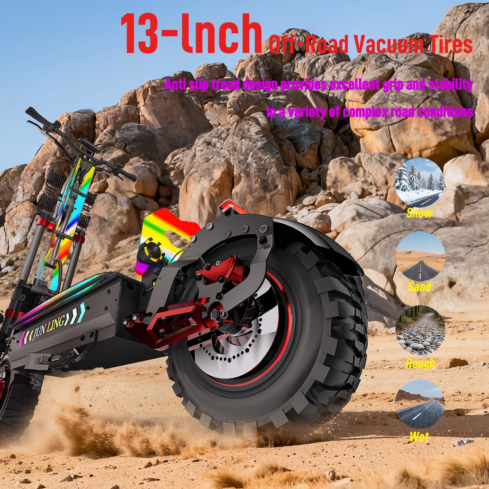 Oversized 13-inch off-road vacuum tires deliver superior traction on dirt, gravel, sand, and uneven terrain.