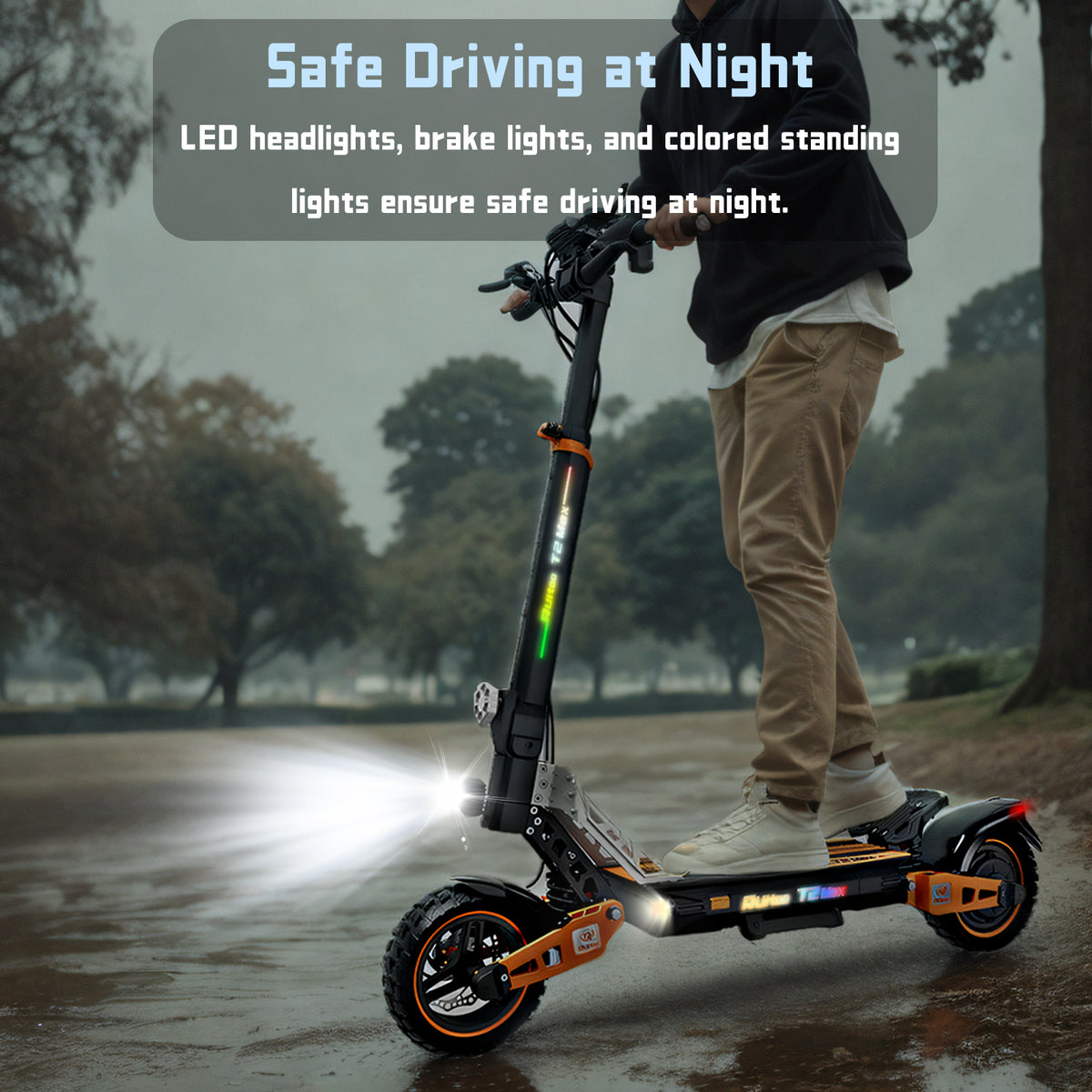 For enhanced safety during night rides, the T2 Max comes with a front LED headlight, left and right turn signal lights, a colorful stem light, taillight, and brake light, ensuring visibility and security in low-light conditions.